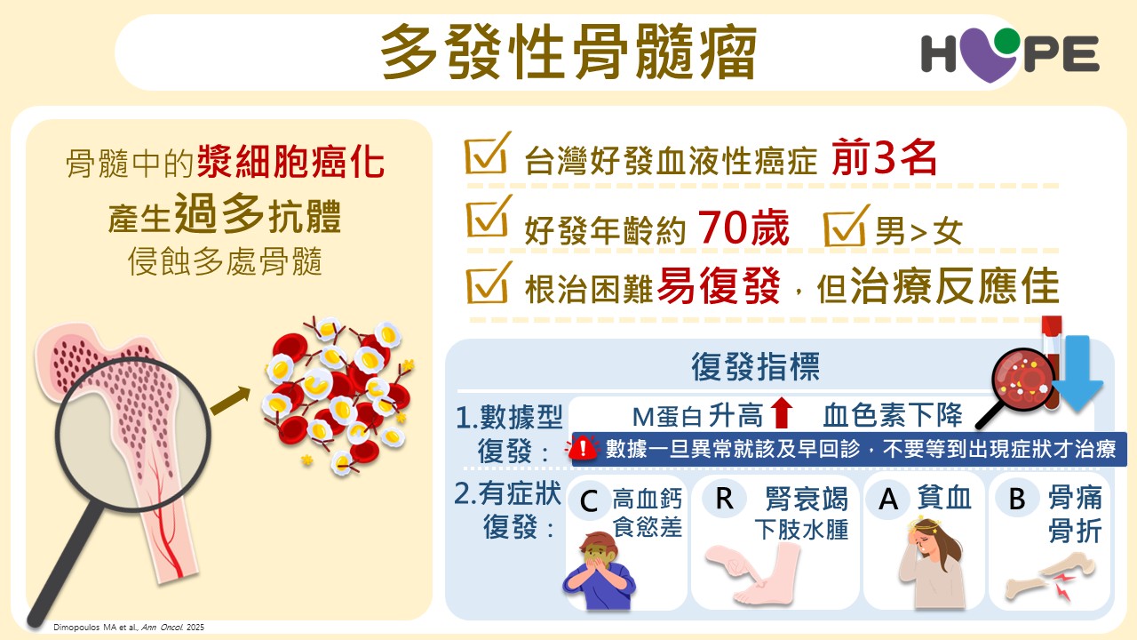 在台灣的血液癌症中,「多發性骨髓瘤(Multiple Myeloma, 簡稱MM)」的發生率高居前三名。雖然這個疾病相對進展較慢,但也因為如此,病友的存活期通常較長,且近年來治療藥物日新月異,為病友帶來了極大的治療希望。