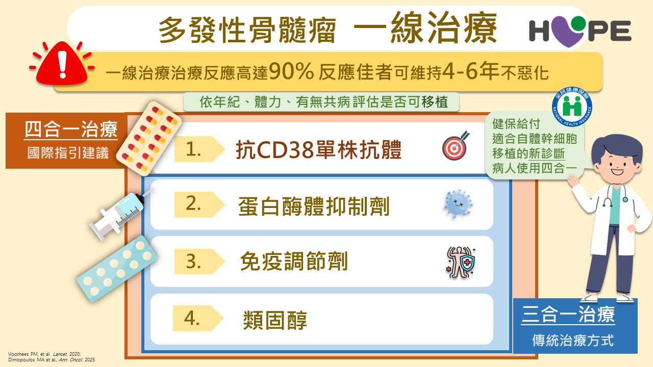 中國醫藥大學附設醫院葉士芃醫師表示,若在四合一療法誘導治療後進行自體幹細胞移植,有機會將無惡化存活期延長至 4 至 6 年以上。目前健保也已給付抗 CD38 單株抗體,讓合適的病人能接受更完整的治療。