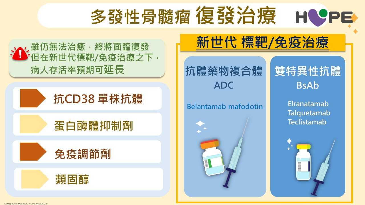 葉士芃醫師進一步說明,多發性骨髓瘤雖然是一種容易反覆復發的血癌,但近年治療已進入新世代療法的時代。隨著標靶與免疫治療的快速發展,即使面對多次復發,病人仍有機會透過新的治療武器獲得更好的控制效果:
