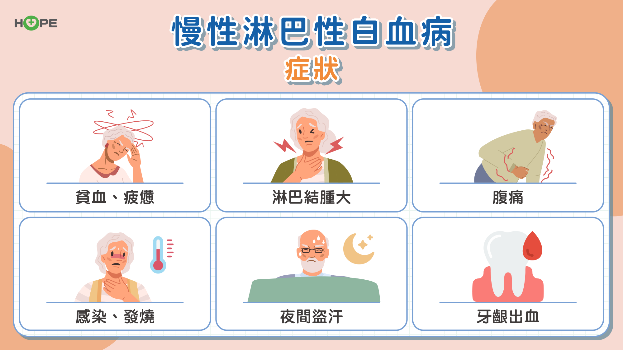 這種疾病進展緩慢,早期往往沒有明顯症狀,許多人是在健檢時被發現白血球過高,進一步檢查才確診。中國醫藥大學附設醫院內科部副主任葉士芃表示,隨著病程惡化,病人會逐漸出現疲倦、貧血、淋巴結腫大、夜間盜汗、腹痛、感染、發燒,甚至牙齦出血等症狀,「一旦這些情況出現,通常代表疾病已經影響到骨髓,壓迫了正常造血功能。」