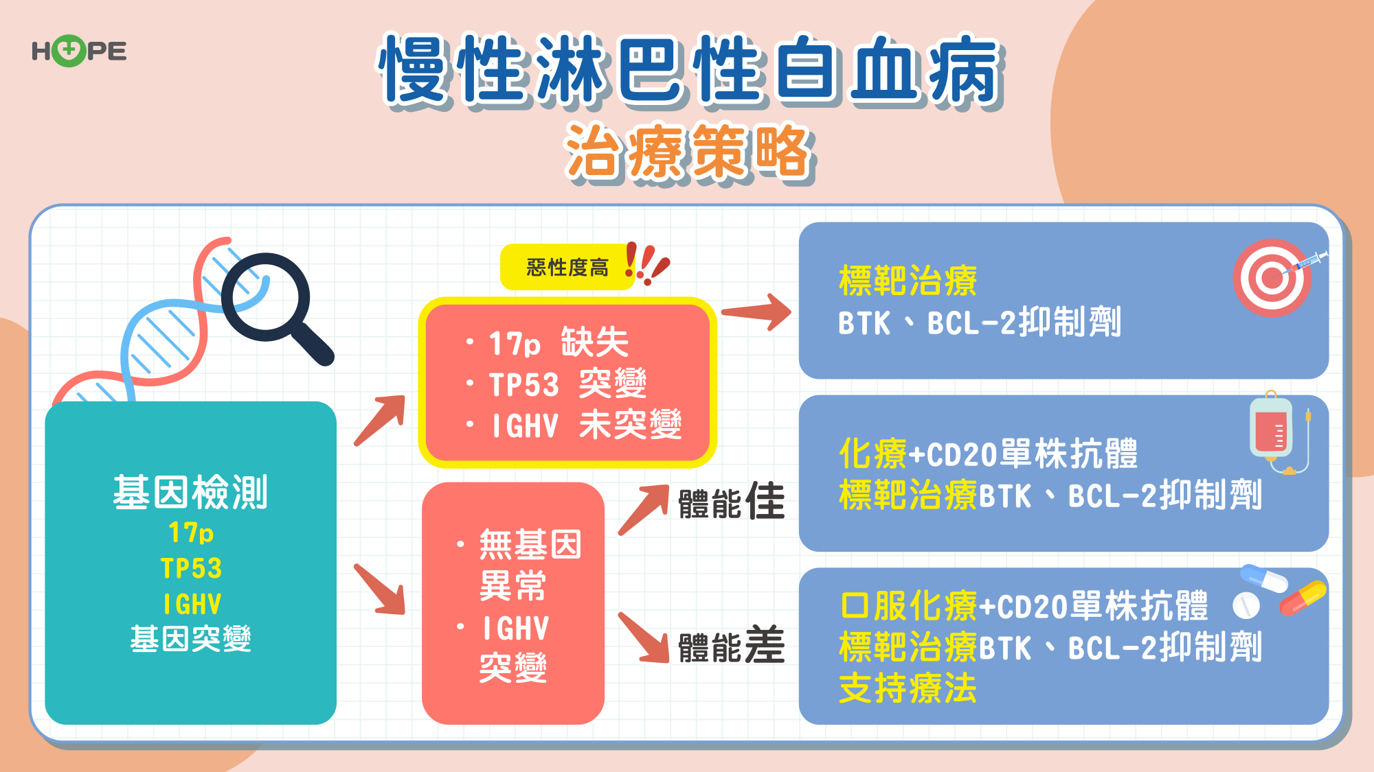 若檢測結果顯示 17p 缺失、 TP53 突變或 IGHV 未突變,代表病情屬於高風險族群,傳統化療效果有限,因此建議以標靶治療為主,例如新一代BTK 抑制劑或 BCL-2 抑制劑,能有效抑制癌細胞生長並延長存活。若檢測結果為 無基因異常或 IGHV已突變,則治療反應通常較佳,選擇較為多元。