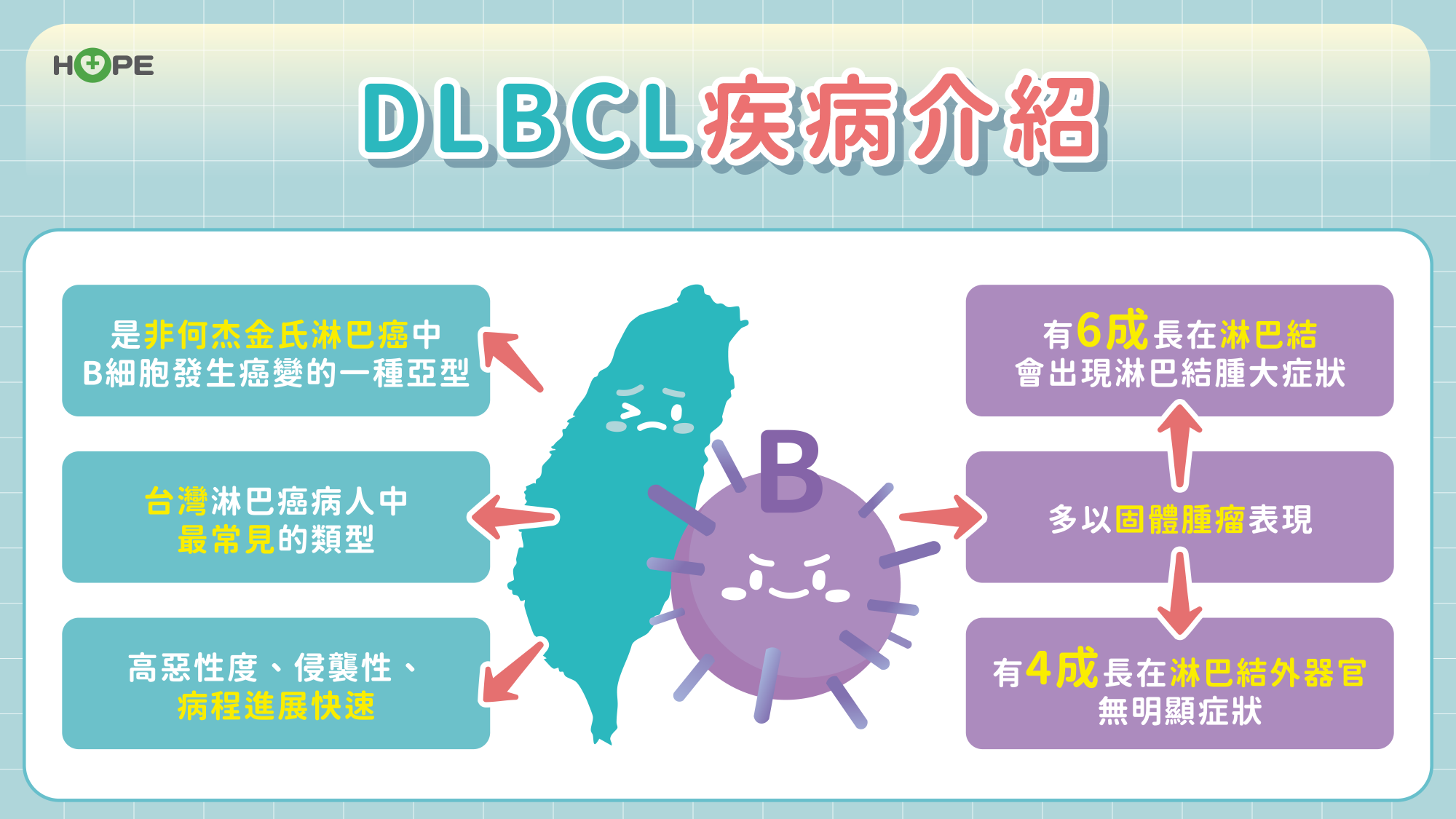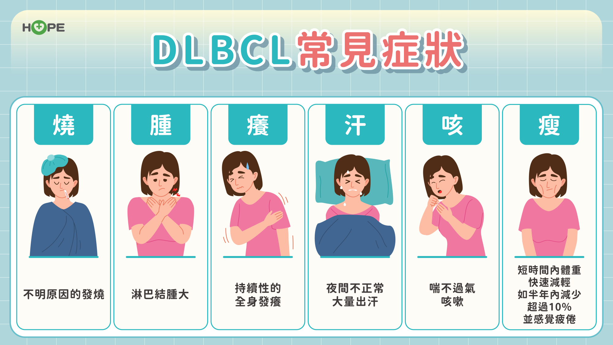 臺大醫院血液腫瘤科主治醫師黃泰中指出,DLBCL 約占所有淋巴癌的四到五成,每年臺灣新增病例約 1400 至 1500 人。超過六成的腫瘤發生在淋巴結,病人可能摸到頸部、腋下或腹股溝腫塊,若腫瘤壓迫胸腔,會引起咳嗽、胸悶或呼吸困難;侵犯腹腔時,則容易出現腹脹、食慾不振。
