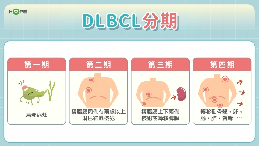 DLBCL 分期依侵犯範圍而定。侷限於單一區域為第一期;同側橫膈膜以上有兩處以上淋巴結受影響為第二期;若上下橫膈膜皆有侵犯,或波及脾臟,則為第三期;若已轉移至骨髓、肝臟、腦或腎臟,則是第四期。