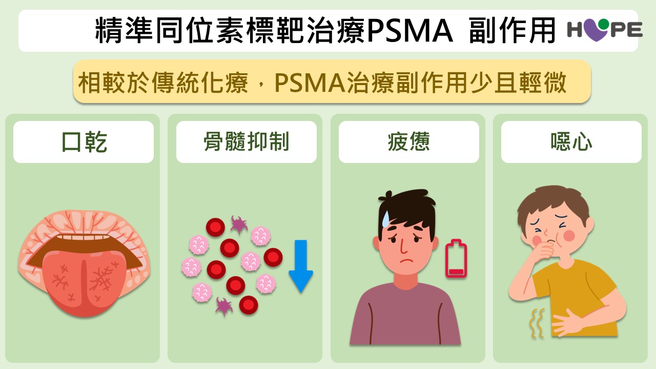 PSMA同位素標靶治療的副作用相較於化療低得多,常見包括口乾、疲憊及噁心。少數骨轉移病人可能出現骨髓抑制,但通常是暫時性的,不具生命危險。