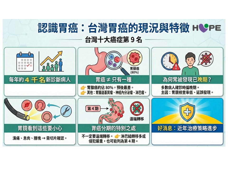 所謂胃癌,其實是一個統稱。陳立宗教授表示,只要長在胃部的惡性腫瘤都會被歸類為胃癌,包含:胃腺癌(約占80%)、胃腸道基質瘤(GIST)、神經內分泌腫瘤與淋巴瘤等,其中胃腺癌是最常見、惡性度也相對較高的一型。