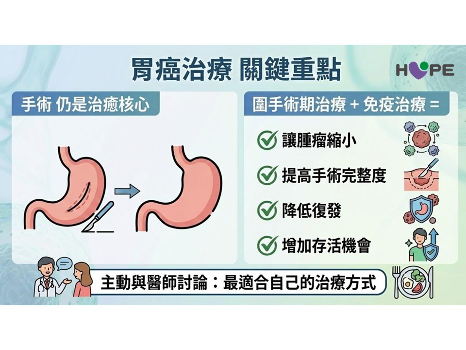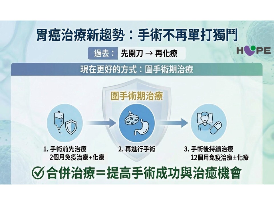 王照元院長指出,過去治療胃癌時,若無轉移之病人多半會直接安排手術,但若腫瘤較大或已出現淋巴轉移,往往難以完全切除乾淨。如今醫界更推崇將「圍手術期治療」作為標準策略,也就是在手術前後搭配藥物治療,從不同階段介入,等於將手術完整「包圍」,藉此提升治療效果與根除機會。