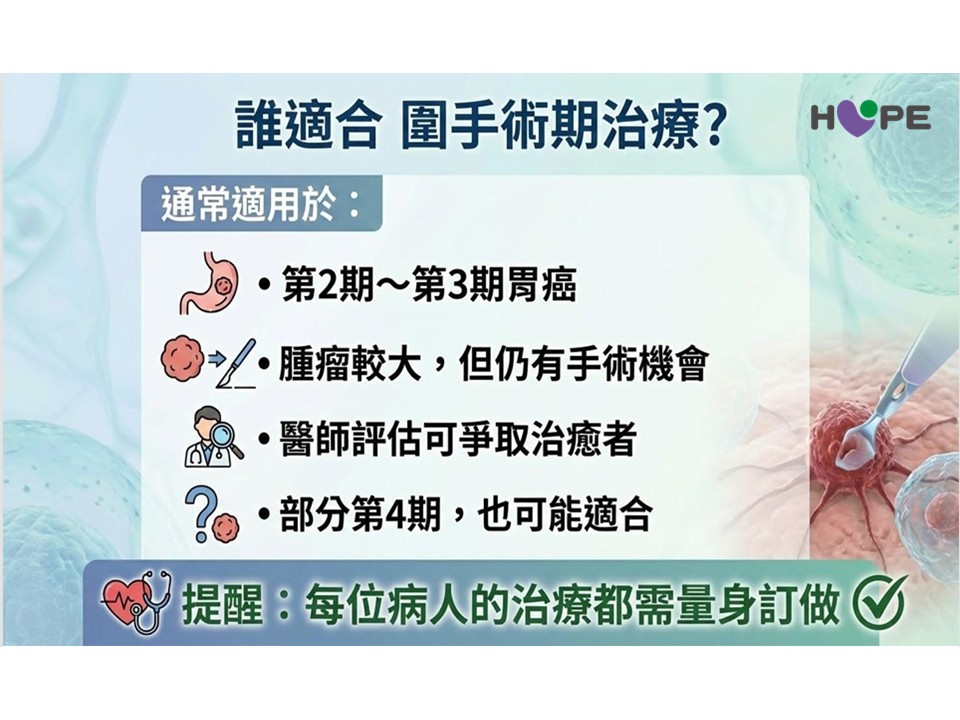 根據國外大型臨床試驗結果,第二期與第三期胃癌病人,是最適合接受圍手術期治療的族群。至於部分第四期病人,王照元院長解釋,若尚無遠端轉移,但局部淋巴結侵犯較為嚴重,仍可經醫師個別評估後,考慮納入此治療策略。然而,一旦已出現廣泛轉移或腫瘤進展快速,手術本身的效益有限,便不適合採行圍手術期治療。