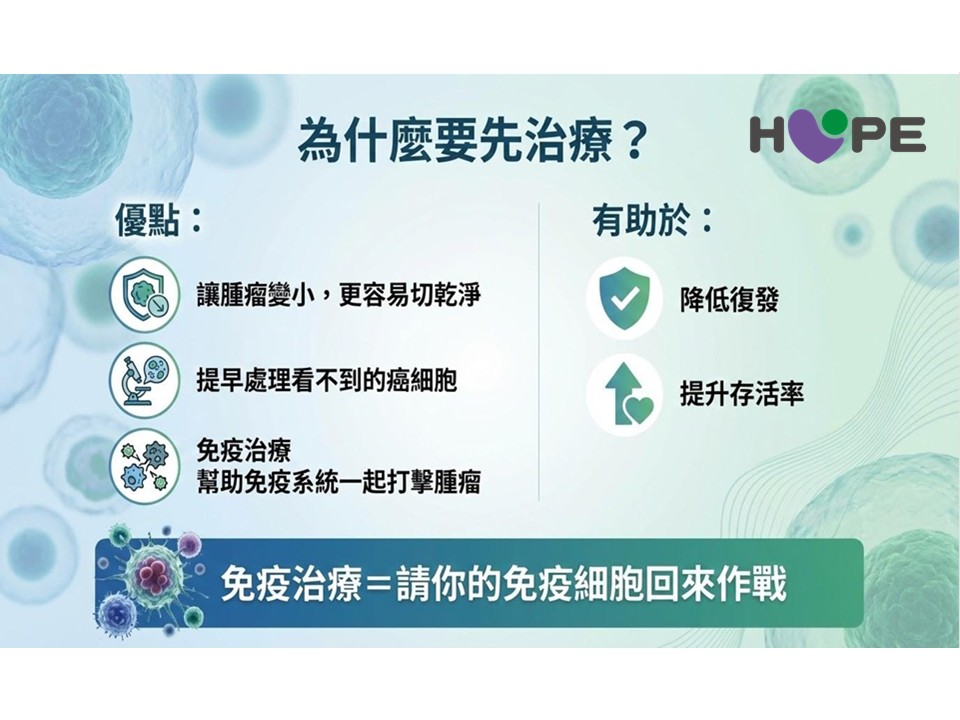 為什麼要先用藥?王照元院長表示,術前的免疫加化療能有效讓腫瘤變小。腫瘤縮小後,不僅手術更容易切乾淨,甚至有機會採用「微創手術」的方式處理,讓病人的傷口更小、復原更快。