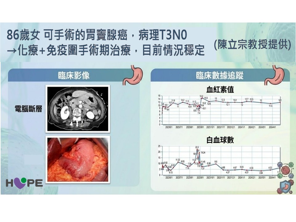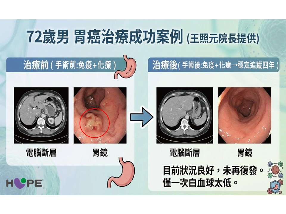 一位72歲男性,確診為第三期胃癌,腫瘤約4公分且有淋巴結轉移。在接受完整的「化療+免疫」圍手術期療程後。雖然過程中曾發生過一次白血球低下,但他仍順利挺過並完成後續的完整療程。手術切除三分之二的胃後,至今已穩定追蹤4年,狀況十分良好 。