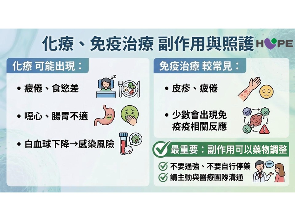 至於免疫治療的部分,王照元院長指出,常見副作用包括皮膚疹、腸胃不適或肌肉痠痛,少數病人則可能出現間質性肺炎。若出現不明原因的呼吸喘或持續乾咳,應立即告知醫療團隊。兩位專家也共同提醒,切勿因身體不適就自行「逞強」減藥或停藥;當副作用發生時,建議主動與醫師討論,透過劑量調整或輔助治療來改善症狀,唯有醫病雙方緊密合作、充分溝通,才能讓治療發揮最大效益。