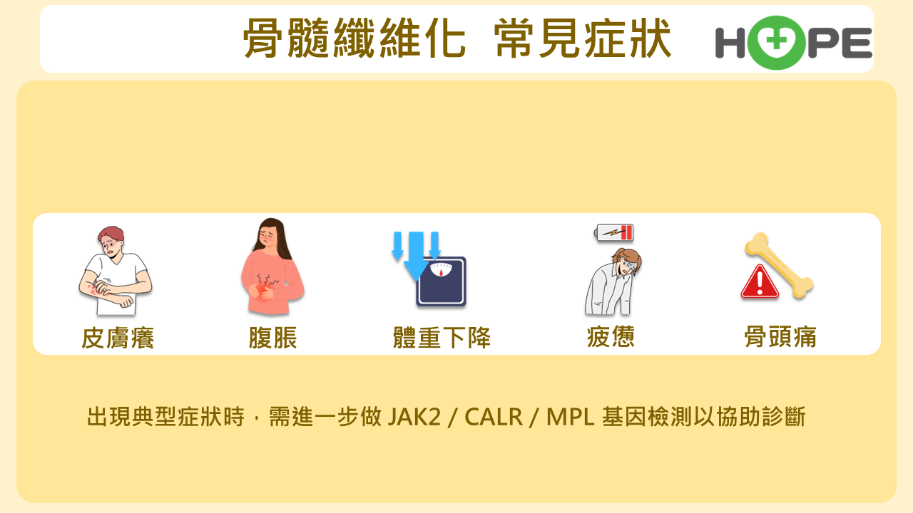 侯信安醫師表示,病人因骨髓無法正常造血,依賴「髓外造血」會導致肝脾腫大,進而壓迫胃部引起腹脹、易飽感與食慾不振。同時,異常細胞釋放的激素會引發全身性發炎反應,嚴重影響生活品質。