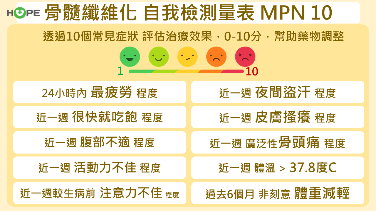 臨床上常使用國際通用的「MPN10症狀評分量表」,病人可以自我評估以下10項症狀的嚴重度(0-10分),而總分與疾病活動度及嚴重度息息相關: