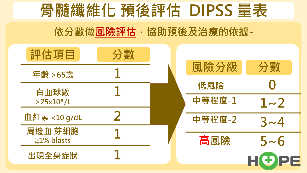 醫師會利用 DIPSS 預後評估量表,依據病人的年齡、血球數、芽細胞比例及全身症狀等項目進行分數分級(低、中低、中高、高風險),高分(5-6分)代表預後較差,甚至可能轉化為急性白血病。