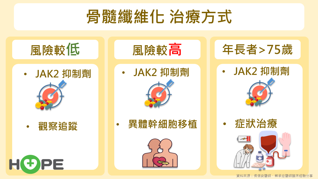 蔡承宏醫師指出,對於高風險病人,長期使用藥物後仍可能演變為急性骨髓性白血病,有生命危險,因此應儘可能進行異體幹細胞移植,以替換有問題的幹細胞,增加痊癒機會。至於超過75歲以上的長者,接受JAK2抑制劑治療時,醫師會更注重支持性治療,如搭配雄性素或排鐵治療來維持體力,並處理貧血、血小板不足等症狀。