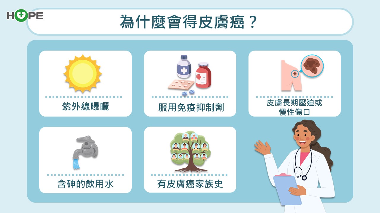 紫外線是導致皮膚癌最主要的風險因素之一。當皮膚長期曝曬在陽光下,紫外線會穿透表皮,破壞皮膚細胞的DNA結構。這種傷害並非一次就發生,而是長年累積下來,慢慢讓細胞出現異常變化,進而癌化。沈醫師提醒,這種長期累積的傷害,往往在幾十年後才看得見後果。其他高風險族群也包含長期使用免疫抑制劑的病人(如器官移植患者)、有家族史的人。