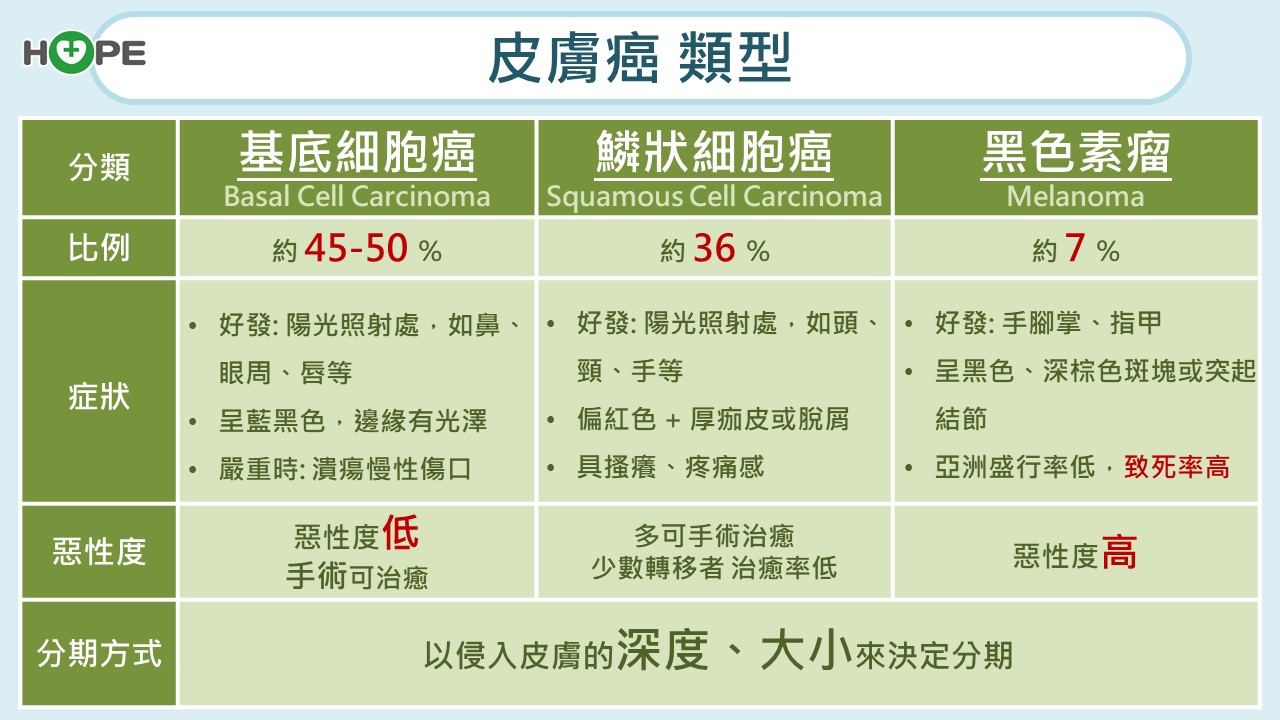 皮膚癌不是單一疾病,而是包含了幾種不同類型的惡性腫瘤。每一種的發生部位、外觀與惡性程度都不太相同,需要特別辨識。