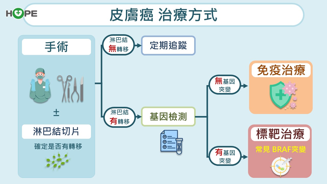 皮膚癌的治療方式會根據癌症的分期而不同。越早發現,治療越簡單,效果也越好。沈醫師說明,第一期通常只需要局部手術切除,效果極佳;第二期可能需進一步檢查淋巴結是否有轉移;若癌症已進入第三或第四期,則可能需要標靶或免疫治療。