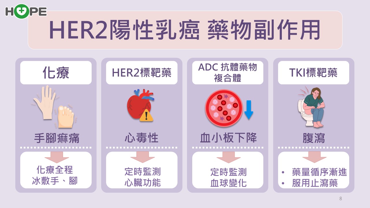 - HER2標靶藥物:可能有心臟毒性,需定期做心臟超音波追蹤。