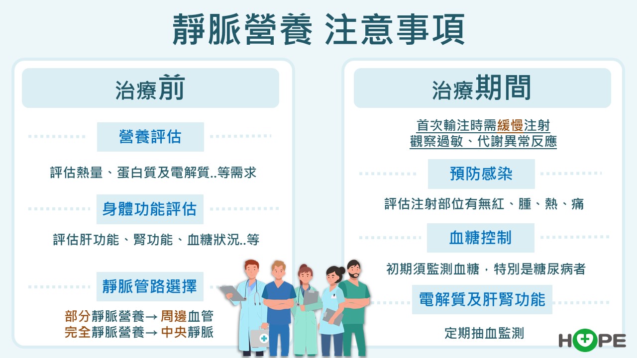 由於全靜脈營養給予的濃度高,因此醫療團隊必須在給予後持續進行嚴密監測。需要小心監測病人的血糖、電解質平衡,並預防感染。同時,也要關注長期使用是否會對其他器官,特別是肝功能造成受損。