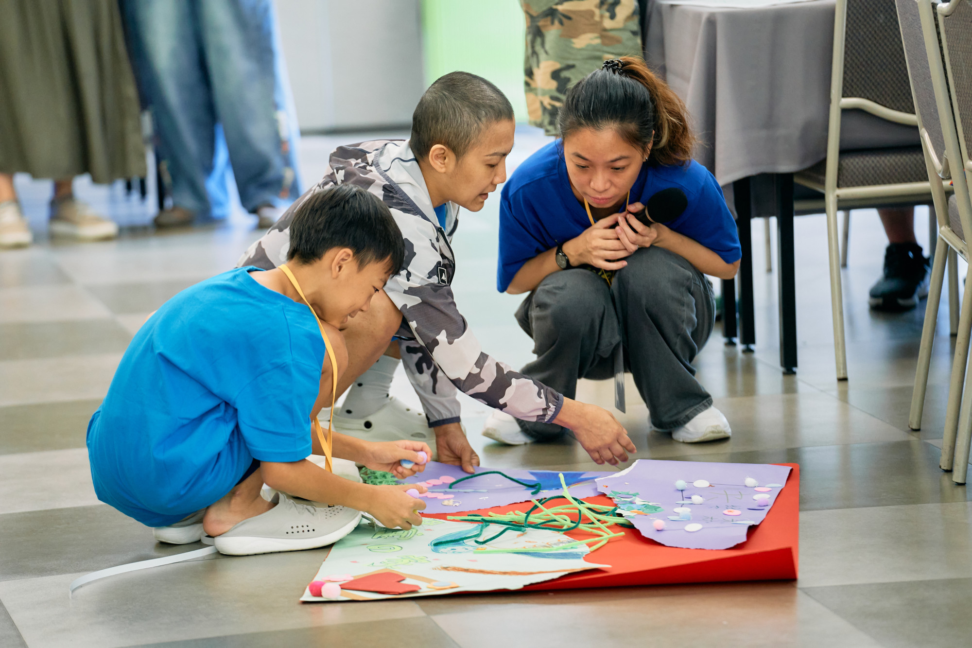 上午的時光被用來召喚家庭的守護力量:八個家庭各自圍坐,在歡笑與討論聲中共同製作專屬的「家庭旗幟」。這是對過往、當下與願景的集體描繪,父親、母親、子女,每個人都在所選擇的顏色紙張上留下屬於自己的印記——有的由父母主導設計,有的則以孩子的意見為優先,家人們在互相合作、爭執中共同創作,每個人都能在上面放入自己對家的主張和想法。圖騰裡有陽光、有貓、有花、有森林,象徵著他們對「家」的愛與認同,以此作為守護之旅的開始。