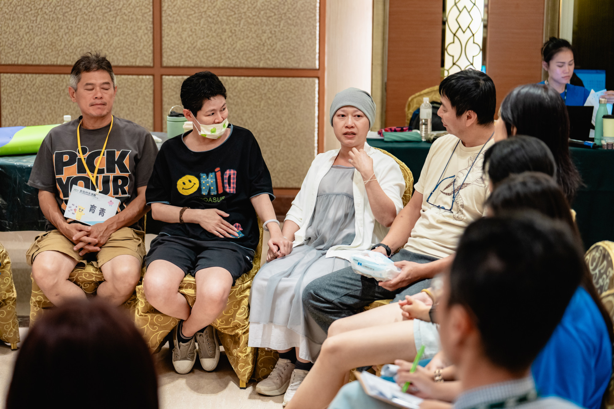 有位爸爸則說自己和兩個兒子都是「媽寶」,他和孩子的生活完全都得依靠自己的太太。自從太太生病後,至今他還在適應當中,甚至還有點抗拒,不知道該如何分享。「本來只是以為切除囊腫,進去手術房之後卻一切都變了,就像韓劇等級的暴風……我心裡的陰影面積很大,到現在還不能適應這件事,真的開心不起來,只有老婆開心時才會讓我感到快樂。」他說話時身體前傾、垂著頭顯得沉重而疲憊,低沉哽咽說明了還未從震驚中抽離。